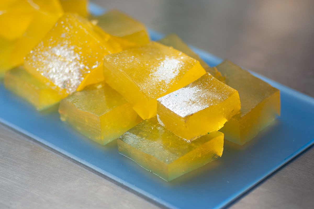 - Zastygniętą galaretkę kroimy na kawałki i dekorujemy posypkami i brokatem jadalnym.