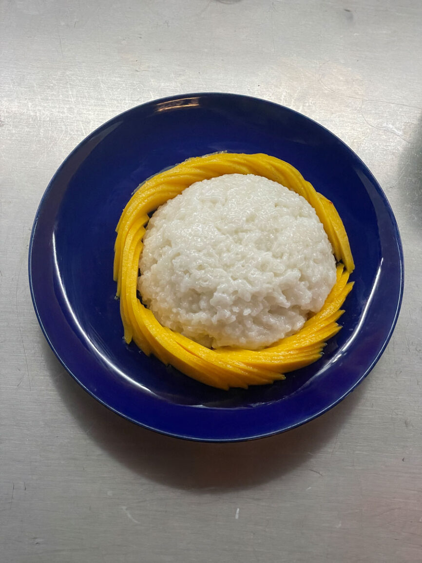 Mango sticky rice opiera się na kokosowym smaku, który w połączeniu z cukrem i mango świetnie się balansuje. Mleko kokosowe najpierw zagotowujemy z cukrem, jego część odlewamy do garnka z ugotowanym ryżem, aby ryż wciągnął mleko. Pozostałą część mleka kokosowego mieszamy ze skrobią i ponownie podgotowujemy, aby zagęścić masę, która będzie sosem do polania całego dania.